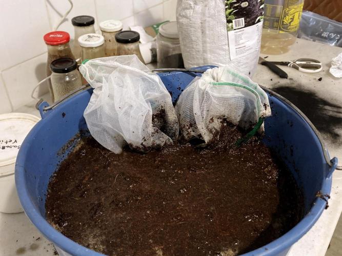 Una vez la plántula instalada en la maceta, he regado con una mezcla ácida (PH: 6.2) de agua de manantial, Microorganismos de Montaña Activados (MMA) de forma líquida y melaza, un 30% de esta mezcla la he aplicado en la base de la maceta y el resto por arriba. Con esta técnica hago una inoculación masiva de microorganismos en el sustrato para que empiecen a trabajar desintegrando, disolviendo y poniendo a disposición de la planta los nutrientes y minerales presentes en el sustrato.