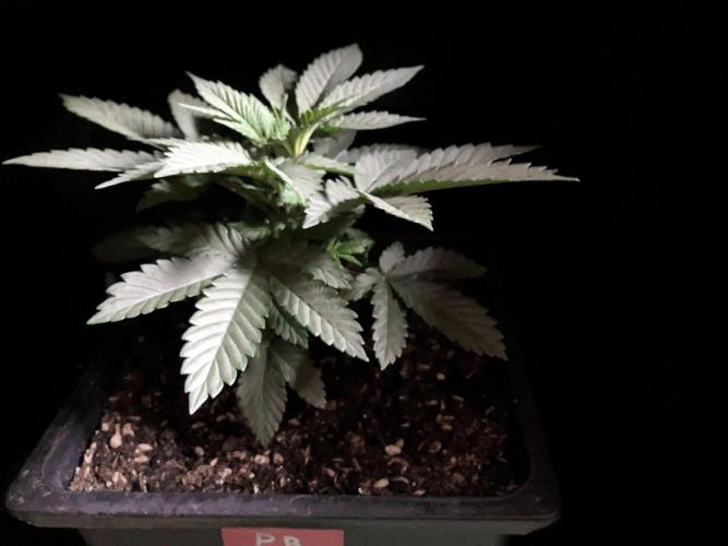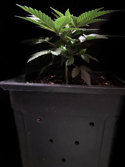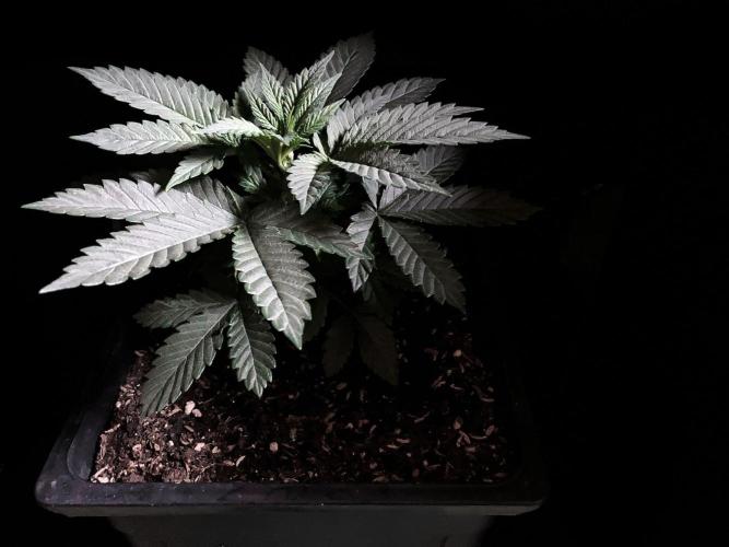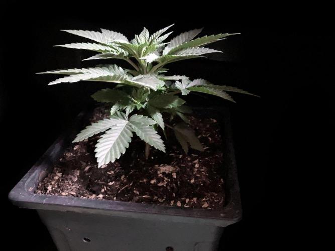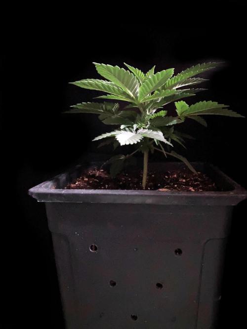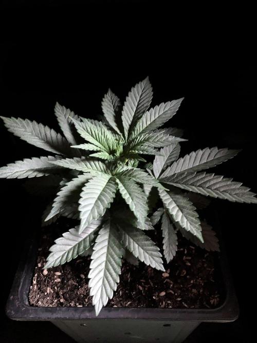 De momento la alumbro durante 21 horas y la riego exclusivamente con agua de manantial, melaza y Microorganismos de Montaña Activados de forma líquida y un poco de Humato de leonardita (ácidos húmicos), de esta manera inoculo masivamente microbiología y favorezco el ecosistema microbiano, para que solubilice los nutrientes y minerales del sustrato, al tiempo y de momento, no fuerzo a la planta a alimentarse con Bio Nutrientes solubles, y de esta manera también facilito la expansión de las raíces por la maceta. Cultivar sin molestar, ese es el objetivo, para que las plantas demuestren desde jóvenes hasta donde pueden llegar.