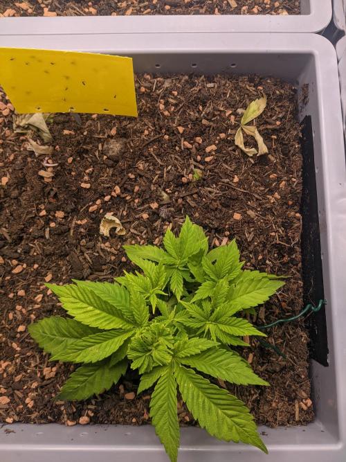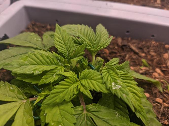 GER: Ich habe den Haupttrieb über die Woche versucht so gut es geht unten zu halten, da sich die Kleine sehr schnell von dem ursprünglichen Herunterziehen erholt hat und direkt die nächste Nodie in "normaler" Ausrichtung bilden wollte. Die Seitentriebe an den so ausgeleuchteten Knotenpunkten sind gut nachgekommen, insgesamt scheint der Strain sich sehr gut trainieren zu lassen. Überlege noch ein wenig länger zu warten, bis sich 5-6 Seitentriebe gebildet haben und dann zu toppen, damit ich eine mainline-ähnliche Struktur bekomme. Habe weiterhin aufgrund von Anzeichen eines N-Mangels in der anderen Pflanze im Topf Kaffeereste in die Erde gegeben (soll laut Internet 2-0-0 sein, müsste also nicht überdüngen). Wassertank musste jetzt tatsächlich ein wenig aufgefüllt werden, waren ungefähr 2-3 Liter. Habe außerdem ein Mittel gegen Trauermücken von oben gegeben.
