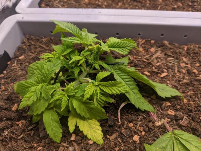lazy_organics EN: Upped the dimming to 50% and slightly raised the lights. Repotted into smaller containers with sturdier bottom, to avoid the previous flexing. As this lost me some amount of soil i reapplied 70g of horse manure into the soil. Hydrations seems to be working better with the new wicks and my sturdiest plant so far is about to develop the third node. One of the Cherry Runtz seedlings died, because the root got stuck in the piece of paper i used to keep its moisture up, so i added some freebie seeds (Critical Punch - will add another report) to not waste space in the boxes.