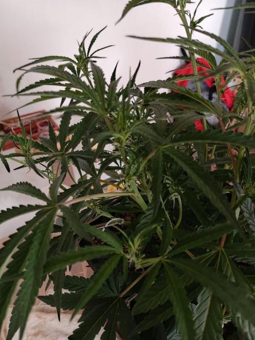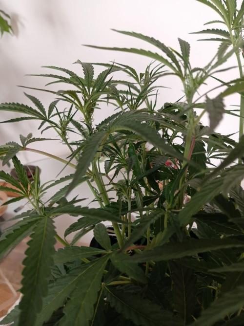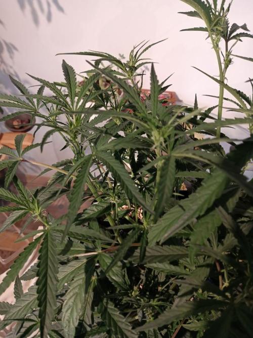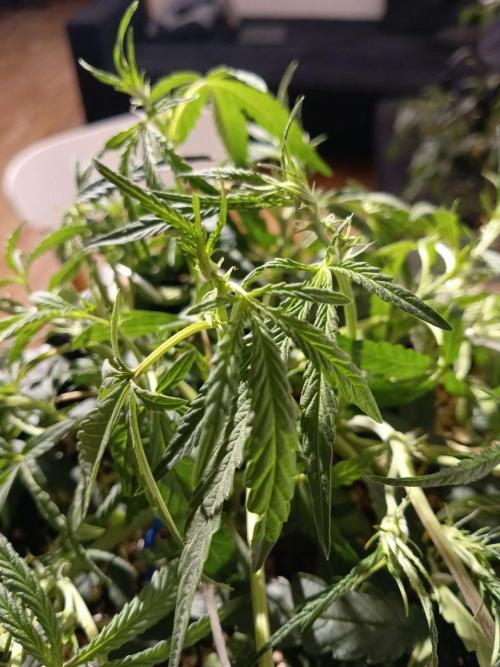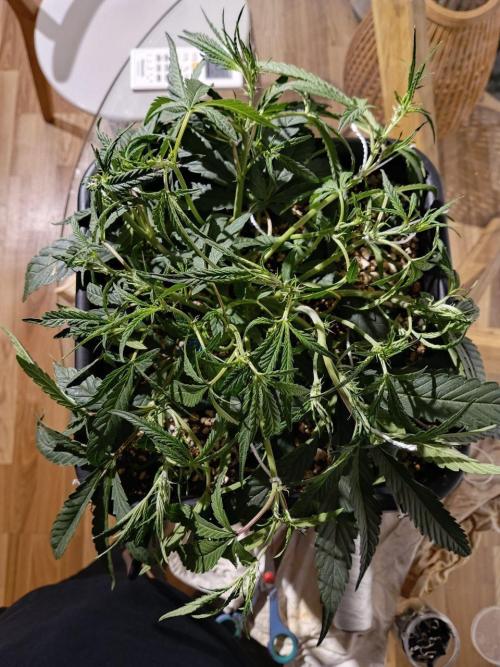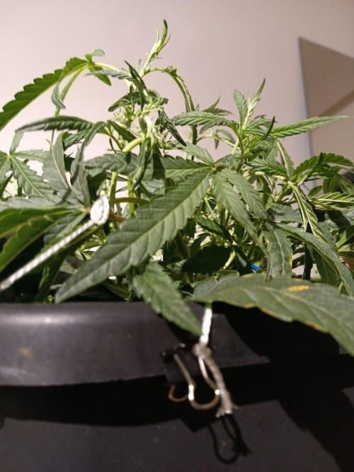 mj0420 This week, I accidentally pulled off a fan leaf on the second floor. The plant didn't seem to notice and grew in size the next day. At the end of the week, I cut off the top and tied up the large leaves, exposing the young stems to light. I really like how this bush started!