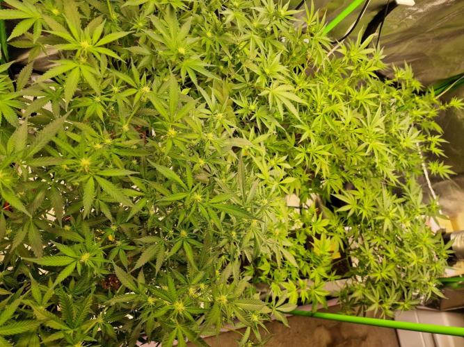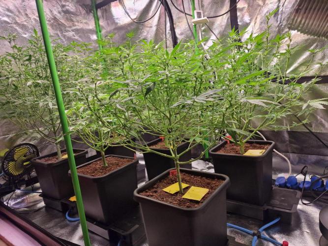 Diese Woche verläuft sehr angenehm, keine Mängel oder sonstige Beschwerden 😁. Die automatische Bewässerung wurde angeschaltet nachdem ich erstmal von oben gegossen habe. 1l Wasser pro Pflanze mit dem Enhancer von Greenhouse. Werde dass alle 2 Wochen so machen aber sonst gibt's nur PH korrigiertes Wasser. Dünger wurde ja der Erde untergemischt. Ach ja, CalMag kommt immer mit ins Wasser bei mir. Wie man gut sehen kann entwickeln sie sich toll soweit. Die Peyote Critical ist um einiges langsamer im Wachstum als die anderen, aber sie sieht sehr gesund aus. Die Gorilla Zkittlez entwickelt sich auch gut, aber liegt eben fast 10 Tage hinterher. Aber was solls, dann bleibt sie eben etwas kleiner wie die anderen😅. Ich denke am Sonntag nächste Woche geht's für alle in die Blütephase. Naja, mal schauen... mach am Sonntag nochmal ein Update.😉 Bis dahin euch allen einen guten Zeit. Ciaoiiiii