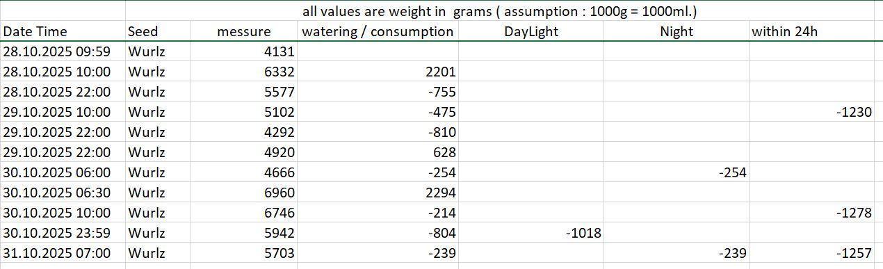Suddenly increasing water consumption without saying anything :) It was basically drought in the early stages. This time I'm giving less. I'm going to try Pieters' handbook video (Canna) for mineral fertilizer (Canna). With 30-40% water content in the soil, I'm only watering what is consumed. For this, I got myself a parcel scale that is accurate to the gram up to 40 kg. This needs to be tested.