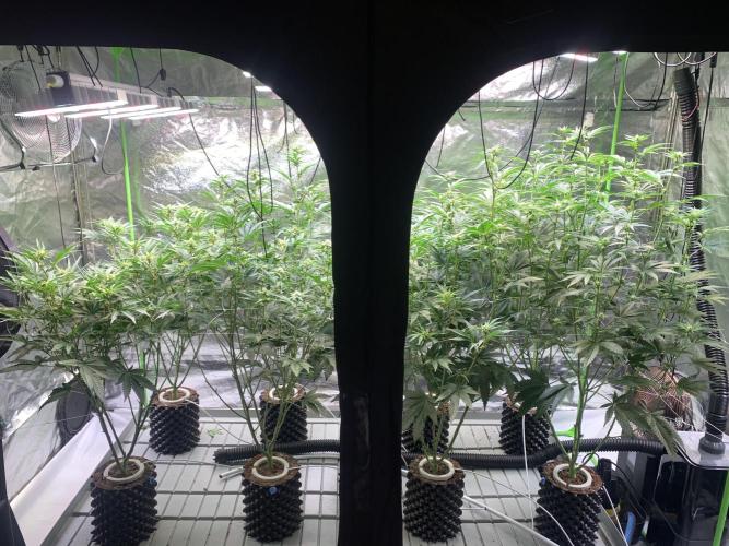 Additionally, low-stress training (LST) was applied to spread out the plants using two nets.