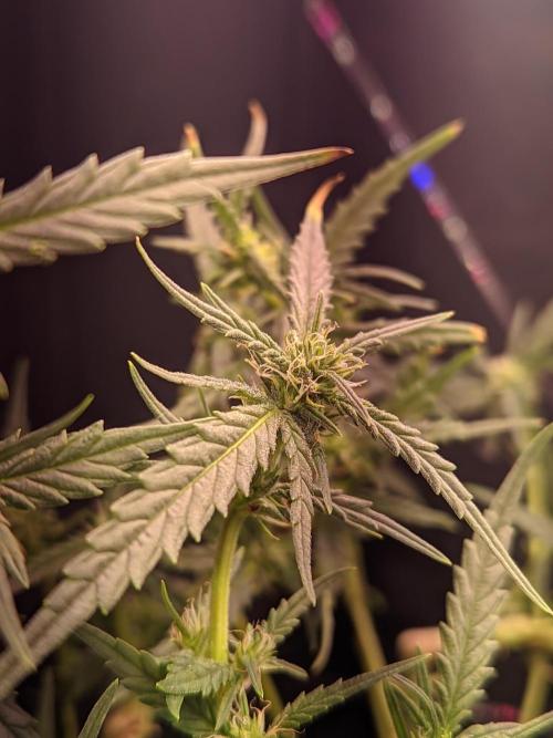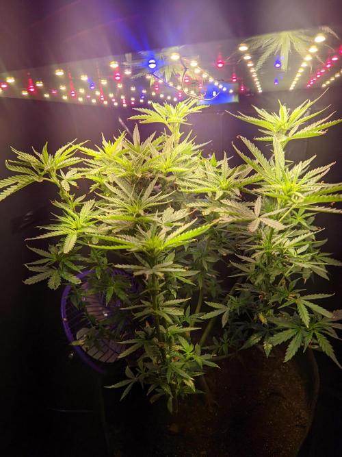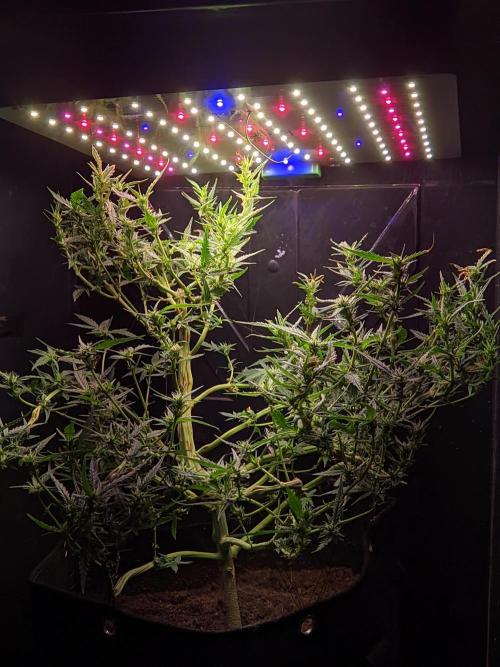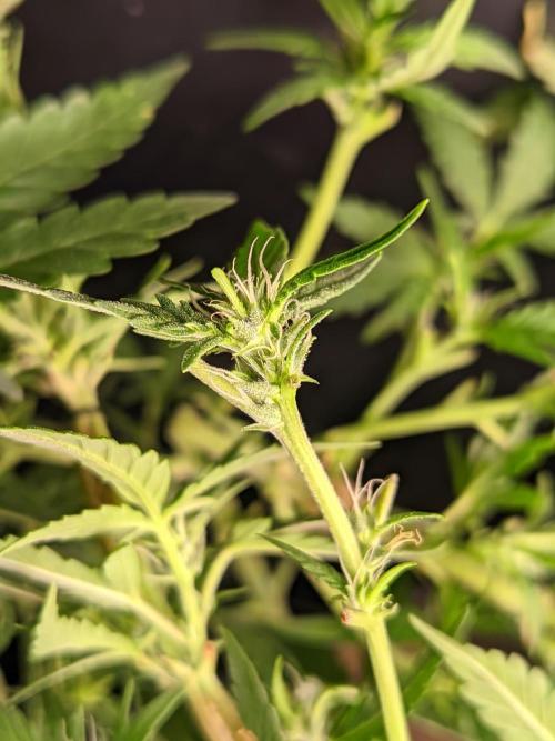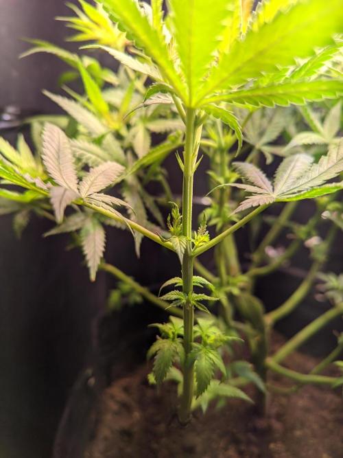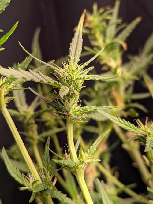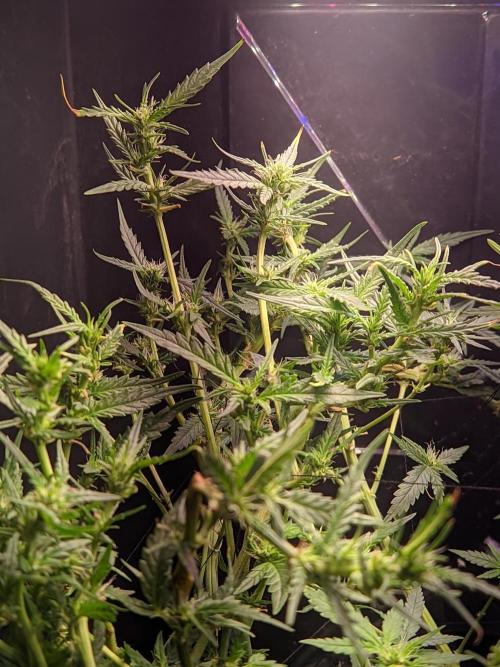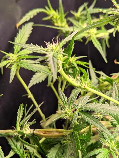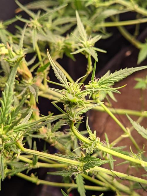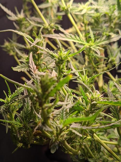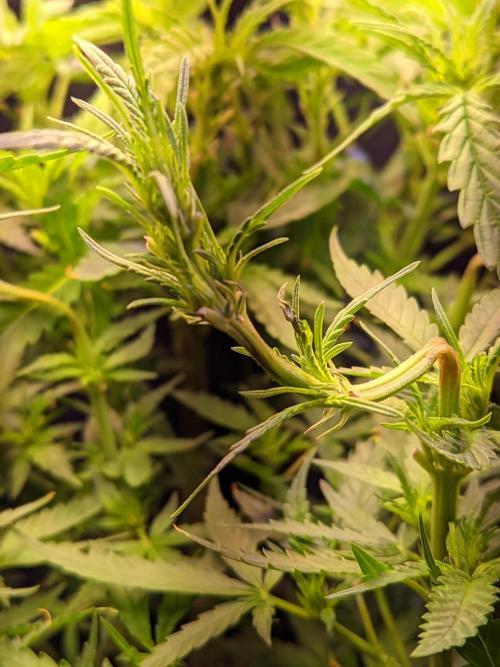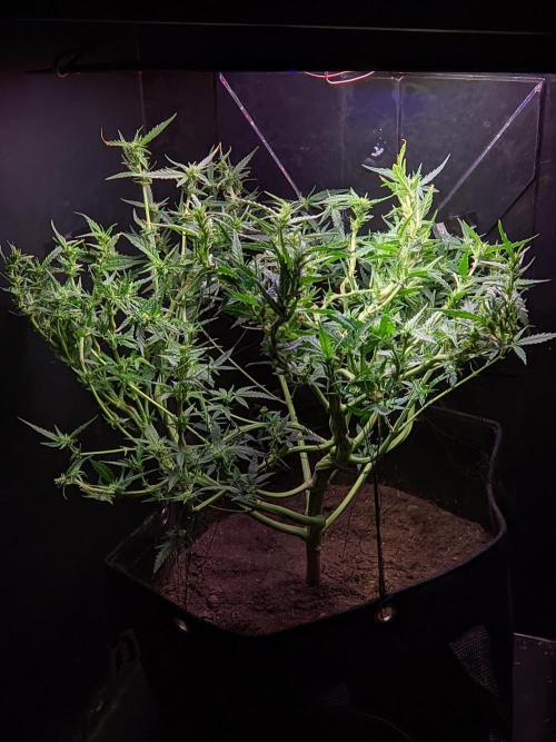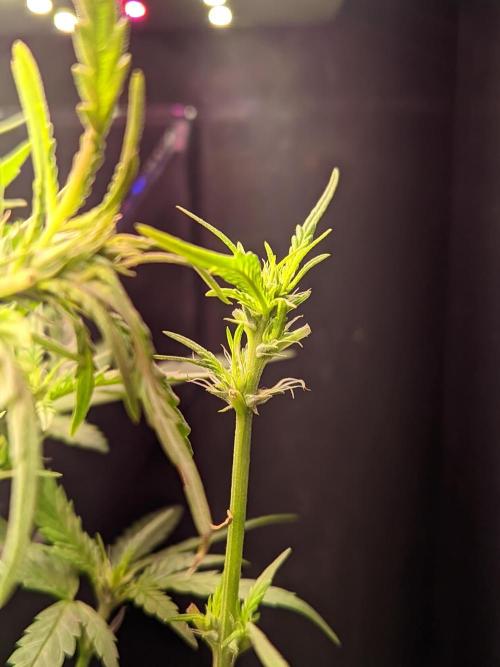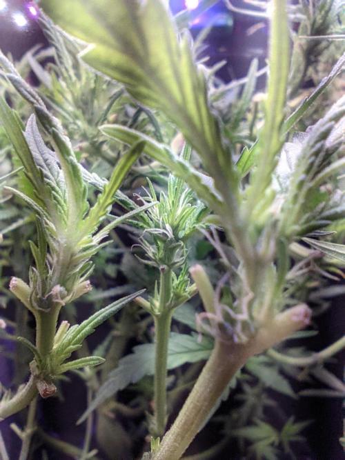 Decretto Inicia-se a primeira semana de floração de fato, pistilos apareceram timidamente. Os ramos ainda continuam a esticar bastante, sendo necessário várias amarras, supercropping e desfolhas para manter a planta baixa e não queimar os topo.