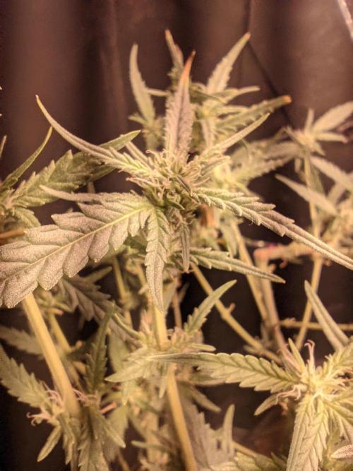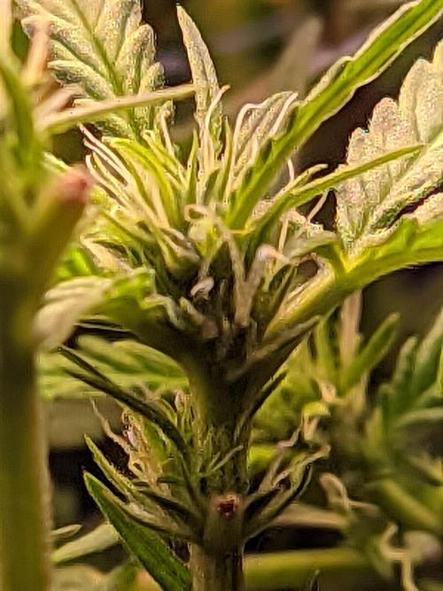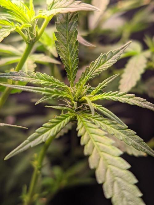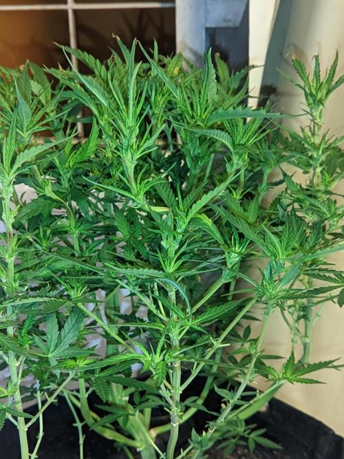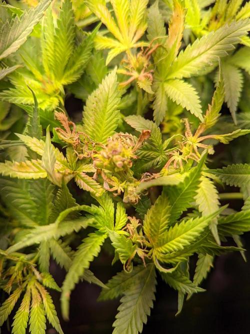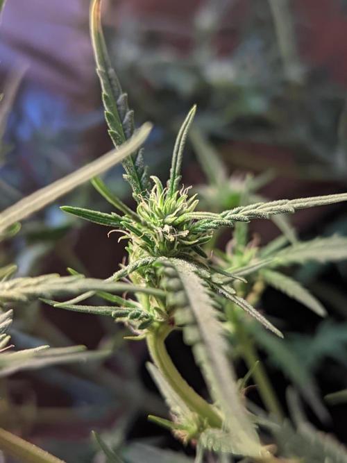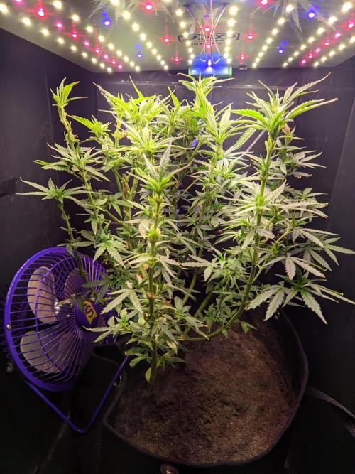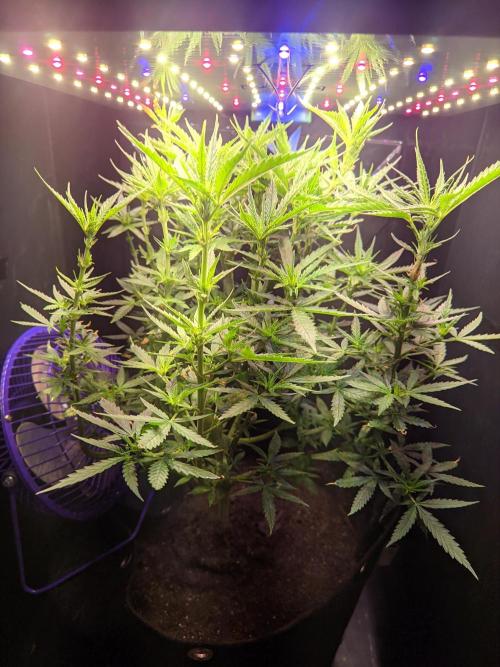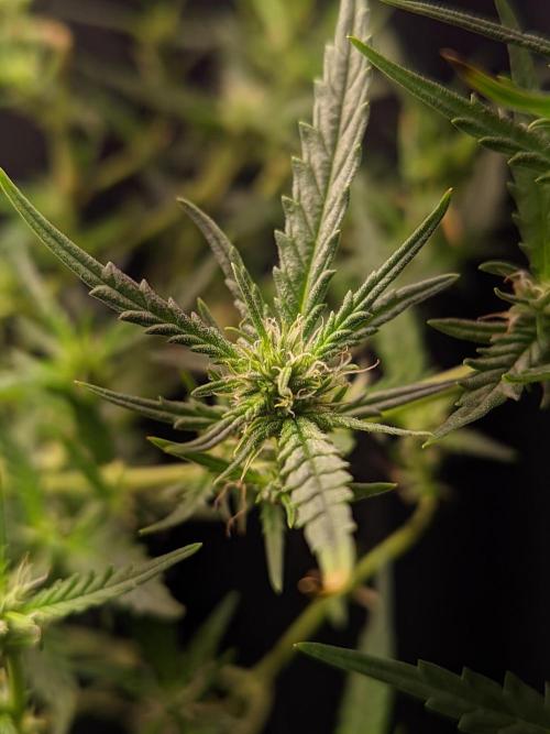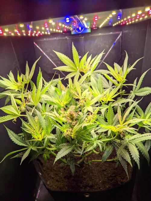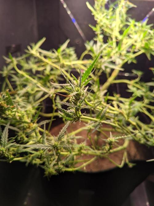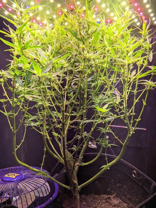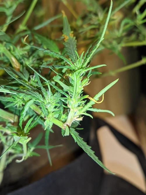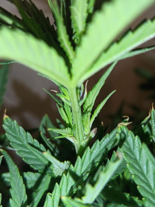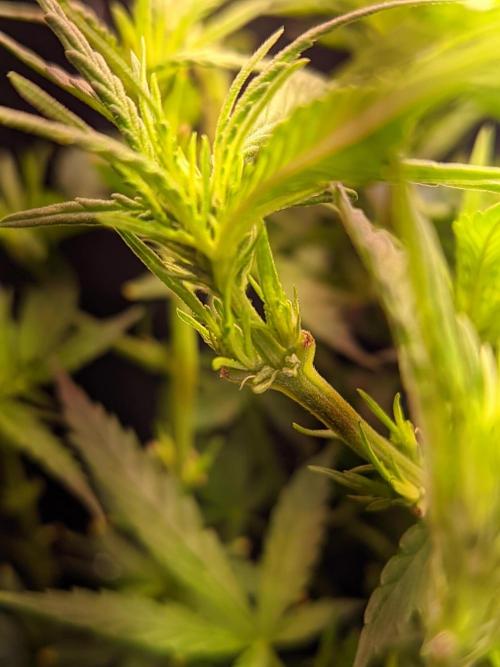 Decretto Inicia-se a primeira semana de floração de fato, pistilos apareceram timidamente. Os ramos ainda continuam a esticar bastante, sendo necessário várias amarras, supercropping e desfolhas para manter a planta baixa e não queimar os topo.