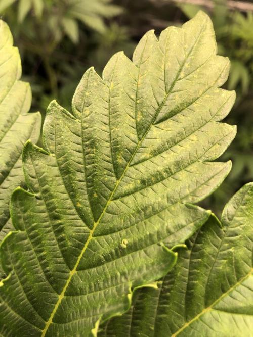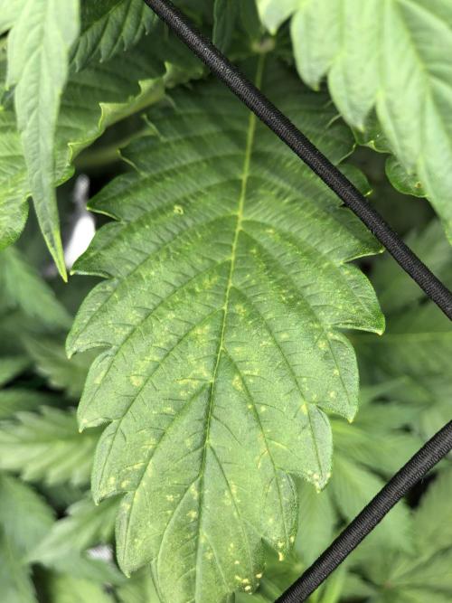 Punkte auf vereinzelten Blättern - gehe von Lichtstress aus, denke nicht es sind Insekten bin aber Anfänger ( unter Seite vom Blatt sieht auch gut aus ohne Spuren )