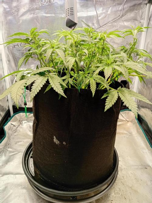 I had less coco than I thought so the surface is only about halfway up the fabric pot. Since the plant grows toward the light, it kinda forces it to create its own canopy. Useless to me now because it is in it's final pot, but next run I'll be doing this on purpose in the first pot. It shapes the plant quite nicely with zero work.