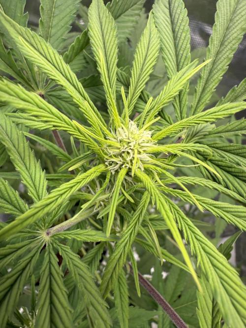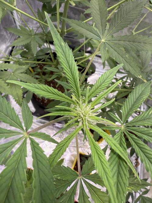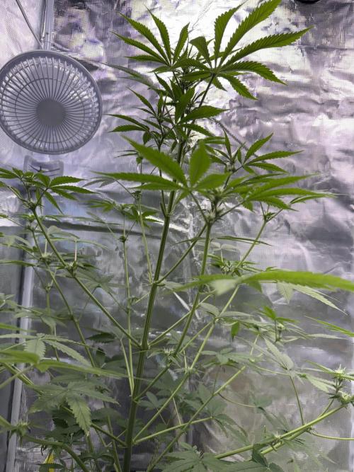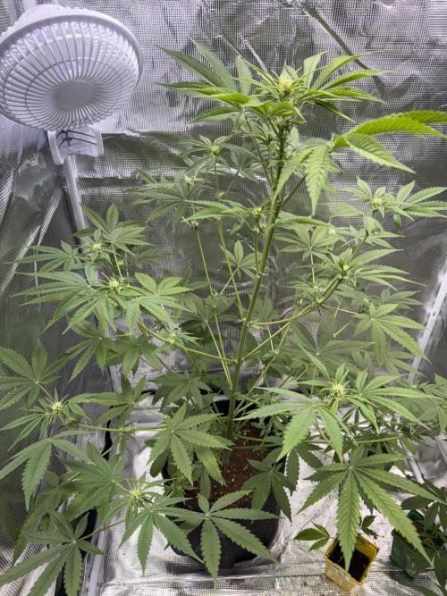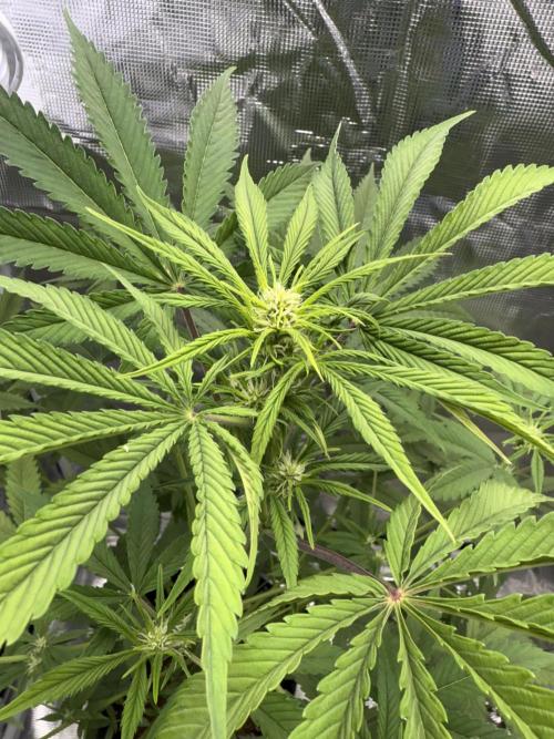 FarmerRasa And now, here is the first week of flower since I am super behind on this diary I am doubling up weeks lol. Buds are showing through now. Had a bit of mold on my pot from humidity a week ago but got this cleaned up and a new fan in to keep airflow better in this tent so there is no issue with that again. She's doing well and very happy. She is stretching a ton and I have had to raise the light to max height now to avoid her top buds getting burned