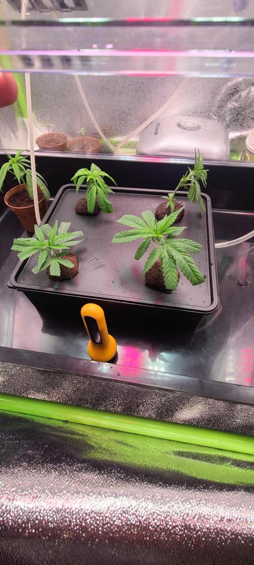 I have also made a mini aeroponic cloner today which fits inside my propagator, who new an old plastic cracker tub, some soil plugs and a few airstones could make something so useful 🤣 This dark phoenix is such a tough plant I don't want to lose her genetics so im goin to try my best to root these cuttings before flipping her to flower next week. All being well by the time these plants are finished I will have at least 4 nice big healthy girls ready to send straight into flower as soon as this stuff is down and dried 🤞