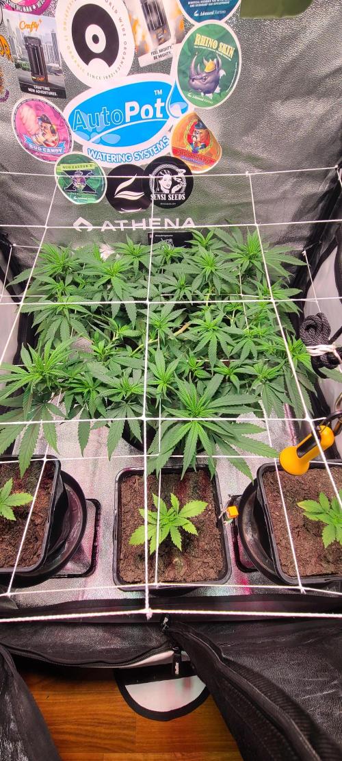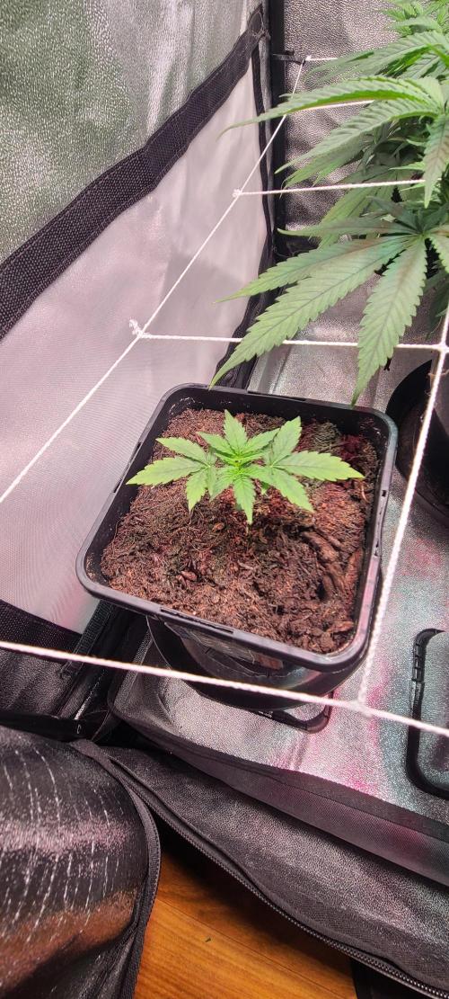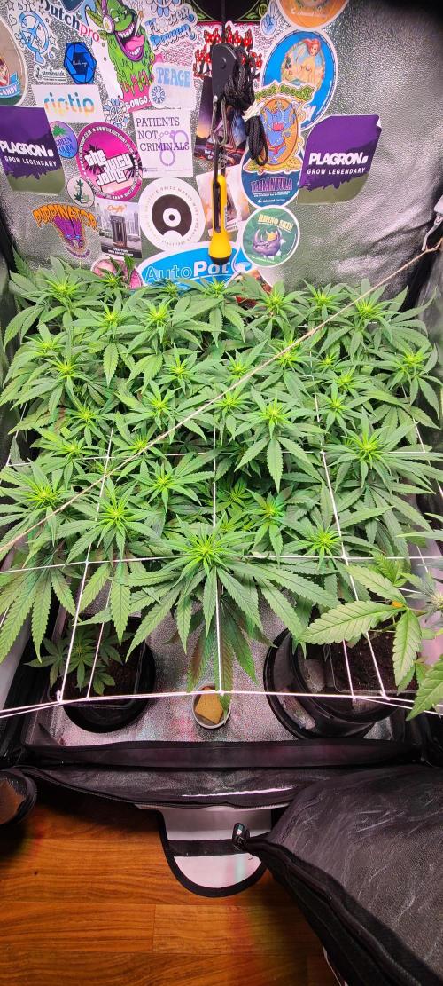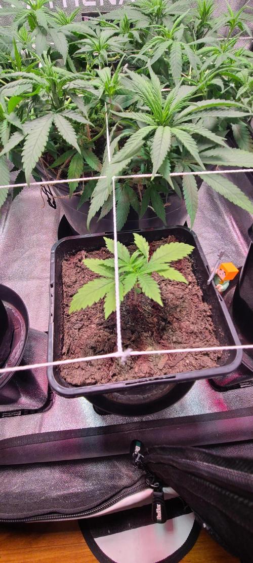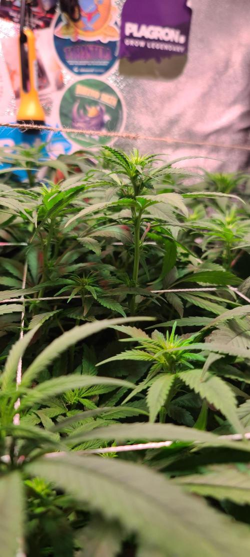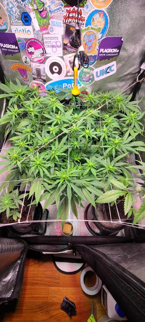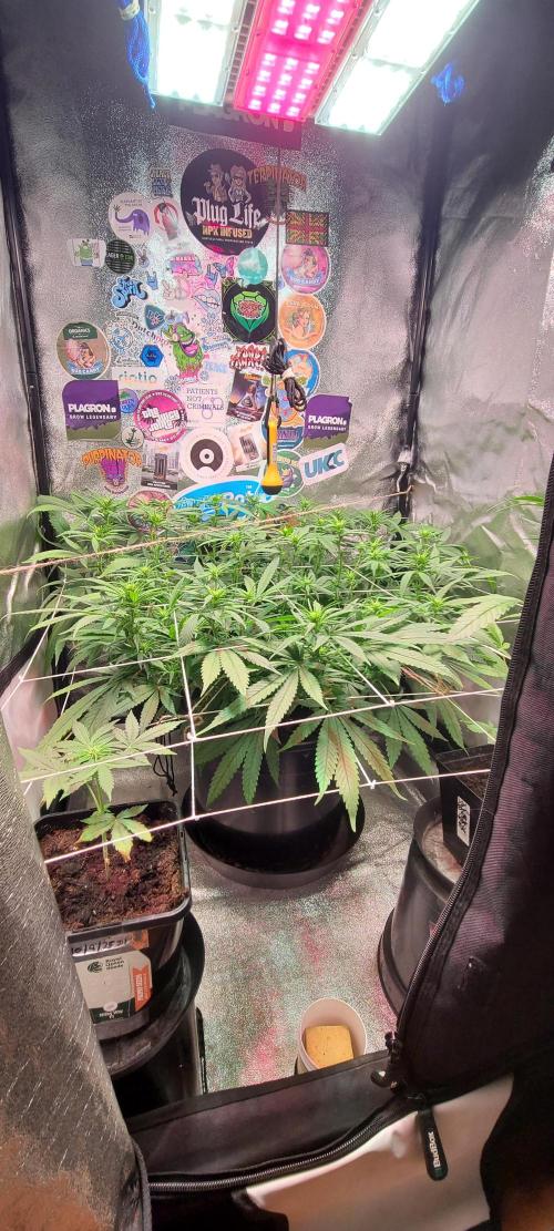 The Dark Phoenix is roughly 10 weeks old but has some issues in the beginning so id put her around week 6 of veg, filling out a 20L pot nicely now though and spread evenly across half my tent thanks to the trellis netting, 1 topping and general tying down. She is the only one in here on the calmag atm but that will change soon