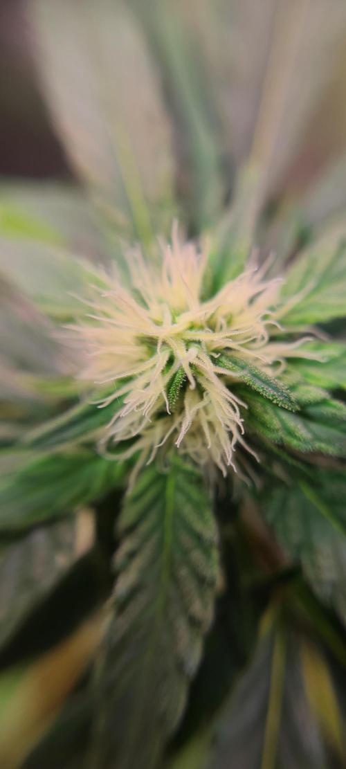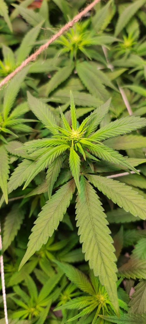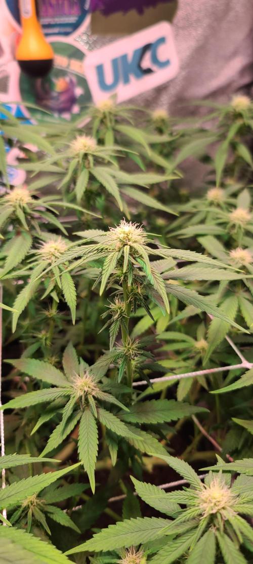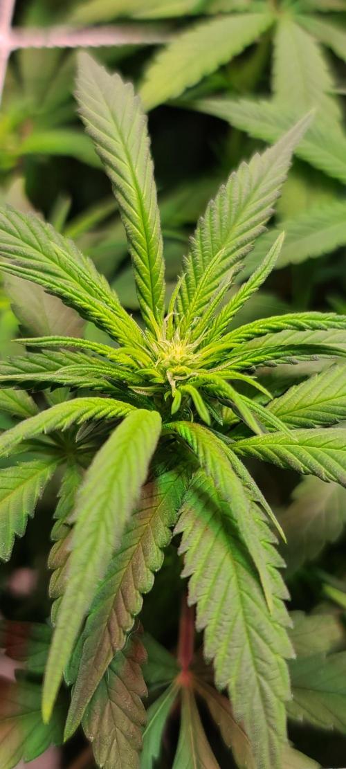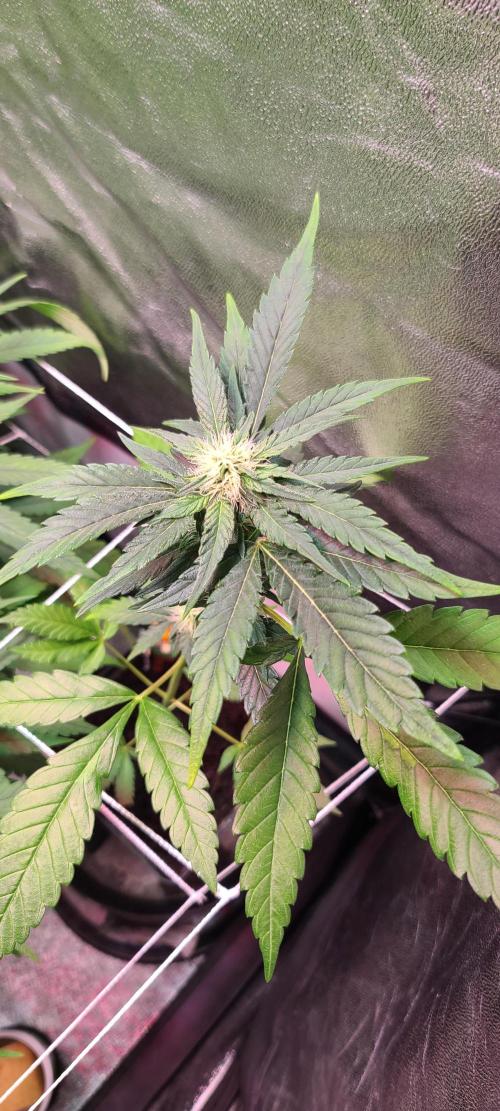 Potgoblin So we are at the end of the 2nd week of flower and it's been a great week for the Dark Phoenix, the palesness I was worried about after her flush has gone and the really deep dark emerald green from.the overfeeding has gone as well, she has just had her first weak feed of bloom nutes after having nothing but water since the big flush, she is also back to drinking 2 litres every other day which is great 👌 once she finishes stretch in a week or so im goin to lollipop her and remove anything that is shielding bud sites