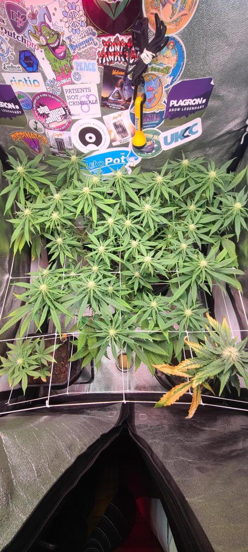 The skinny 3rd plant in the corner which I broughtt back in from the greenhouse had her first feed of PH Perfect Bloom from advanced nutes the other day, it has greened her up and she's started producing little white flowers already. Thought that one was a Stardawg turns out she's Northern lights lol