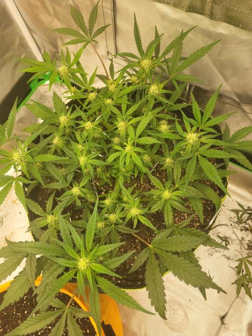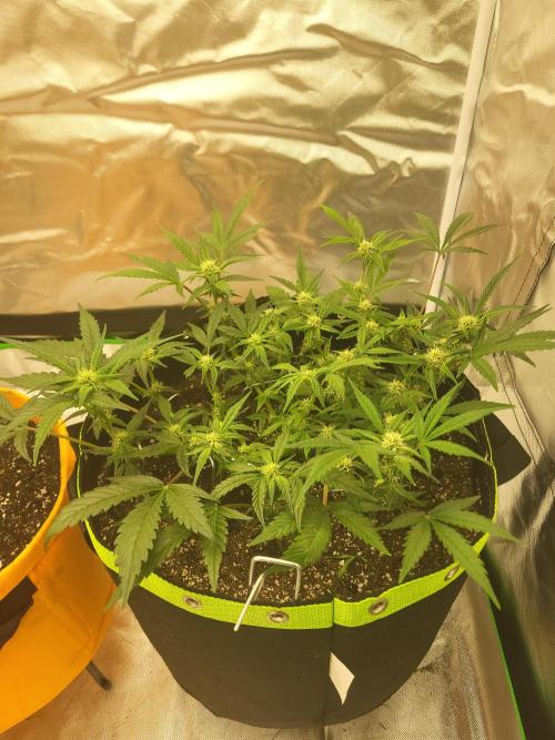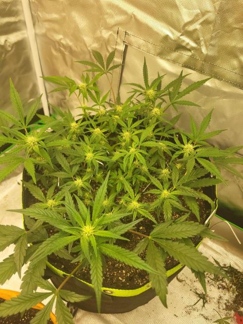 CooperM 12 days after initial post and pics after starting lst. She went into flower on day 22 so maybe 5 to 7 days too early, unfortunately. However, my canopy is even and I. Just letting her furrow now and I'm just adjusting everything so slightly here and there, to keep it even worh minimal adjusting.