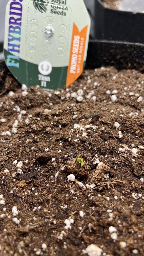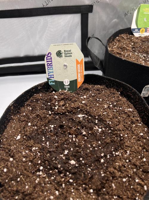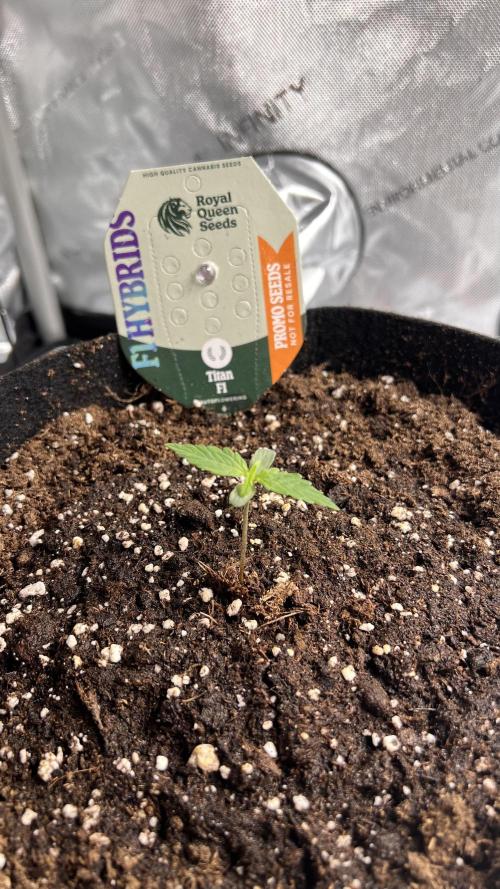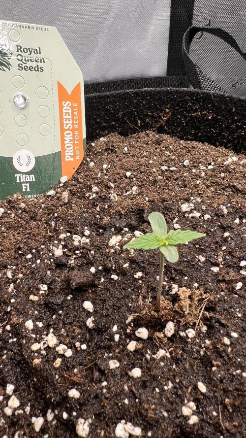 Growtendo64 The seed popped and Miss Titanica showed her first leaves. She’s in an 11L fabric pot with BioBizz Light-Mix under the SF-1500. From now on the diary starts.