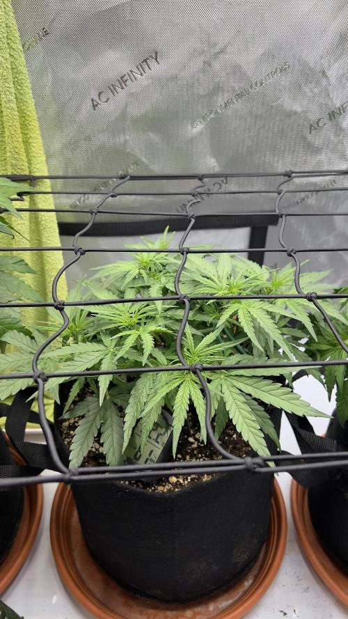 Growtendo64 Miss Titanica is growing strong and steady. She handled the topping and light defoliation very well, staying compact with nice side growth starting to form. Feeding has been increased slightly, and she’s responding with vibrant color and a healthy, bushy structure — the SCROG prep is looking on track.