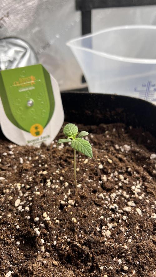 Growtendo64 She broke through the soil and started stretching a little, showing steady early growth. Watered lightly with Root Juice and kept humidity stable. By the end of the first week the first true leaf appeared — looking healthy and balanced.