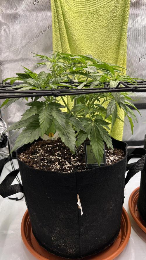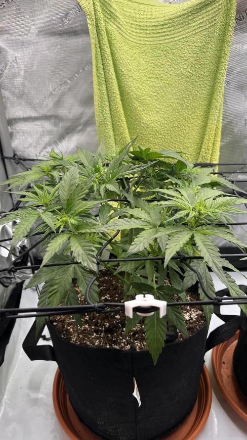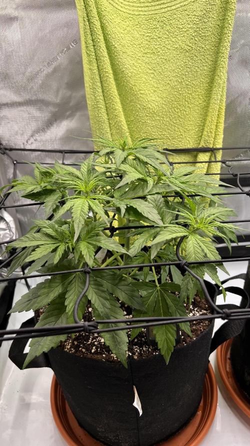Lady Hazel recovered well from the defoliation and started to stretch slowly. The first pistils are forming nicely, and I’ve begun gentle SCROG training by tucking her tops under the net. She looks strong and compact, showing healthy color and steady growth under the new bloom mix.