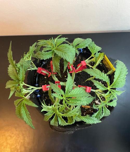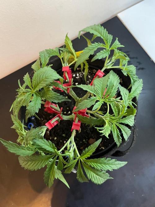 The plant is growing really nicely. It’s tending to stretch more vertically, which made it easy to train. I’ll soon flip her into flower with the 8 main shoots, once I’ve spread her out a bit more over the pot. I’m really looking forward to that. I just hope she doesn’t stretch too much in height.