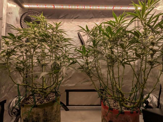 Not sure if I got a dud in the double grape (DG) seed. There's a missing branch on node 3 and, with regards to height and width, is being outpaced by Forum Stomper x Hubbaforgotrealname (FSx). Both plants are currently growing node 6 and going to top there, and also probably remove the bottom node. Original plan was to have 8 main branches with 2 bud sites each, so basically 16 buds for each plant, but with the DG plant missing branch on node 3 not sure yet.