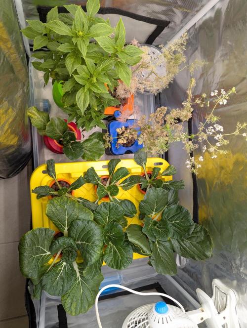 Basil has bolted, and it never did look as healthy as the others. so probably did something wrong with her. Have to take her down now. Germinated some bok choy seeds for first time! Excited to grow it after seeing hydroponic video on it. They're only going to be tent for little while until ready for new home in hydroponic tower.