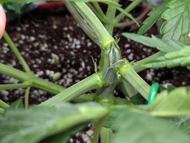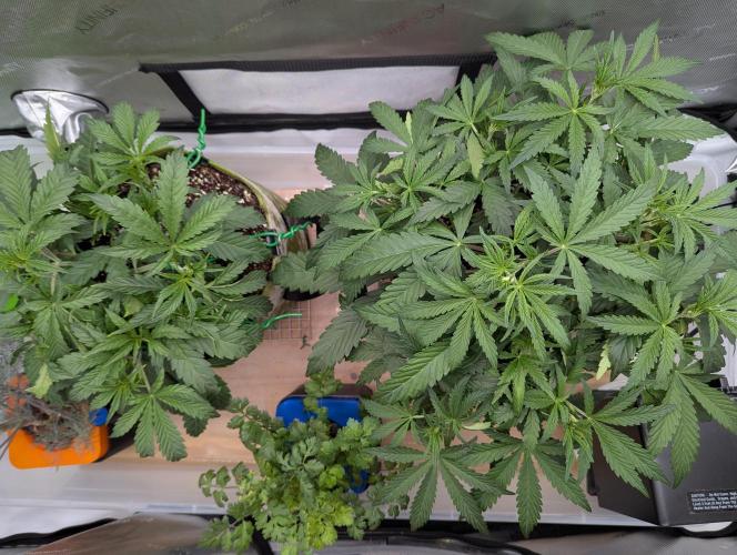 Looks like pre-flower pistils evident on both plants so for this grow we'll say flower starts tomorrow. Topped both at 6th node earlier this week and followed with LST and mild defoliation. Ideally would have wanted to top 2nd time but maybe too late for that? Also, have a scrog net if needed, but that would block light from the smaller companion plants. FSx currently at 8.5" and DG at 6".