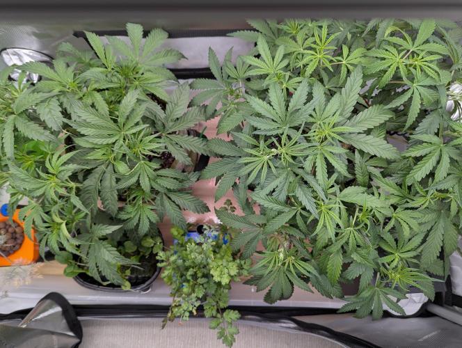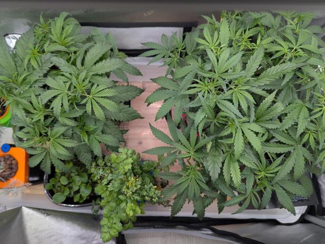 Bok choy seedlings doing ok with 50% nute strength. Not sure how much longer they'll be in tent. Most of the dill plant is much paler than I'd like and the leaf edges of the Thai basil look burnt, but the cilantro is showing great growth and I got to taste test some today with some ramen! These plants are sharing the same 20/4 light cycle as the MJ plants so this can't be too beneficial for them. Grok said it could lead to early bolting so we'll have to watch out for that too.