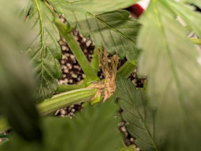 Not sure if I got a dud in the double grape (DG) seed. There's a missing branch on node 3 and, with regards to height and width, is being outpaced by Forum Stomper x Hubbaforgotrealname (FSx). Both plants are currently growing node 6 and going to top there, and also probably remove the bottom node. Original plan was to have 8 main branches with 2 bud sites each, so basically 16 buds for each plant, but with the DG plant missing branch on node 3 not sure yet.