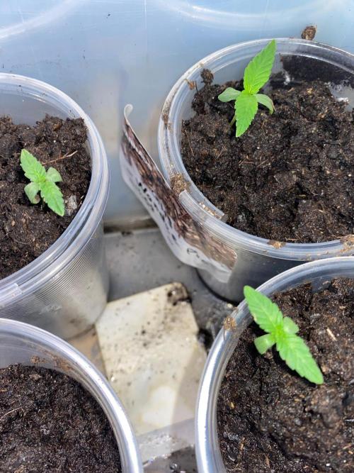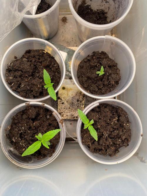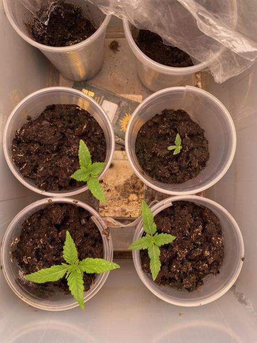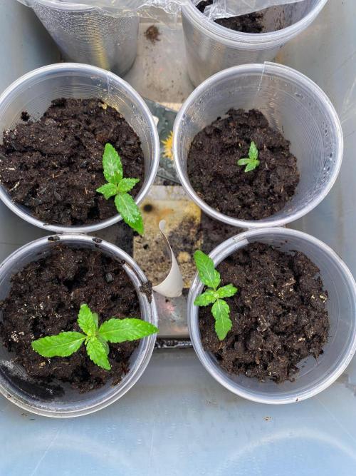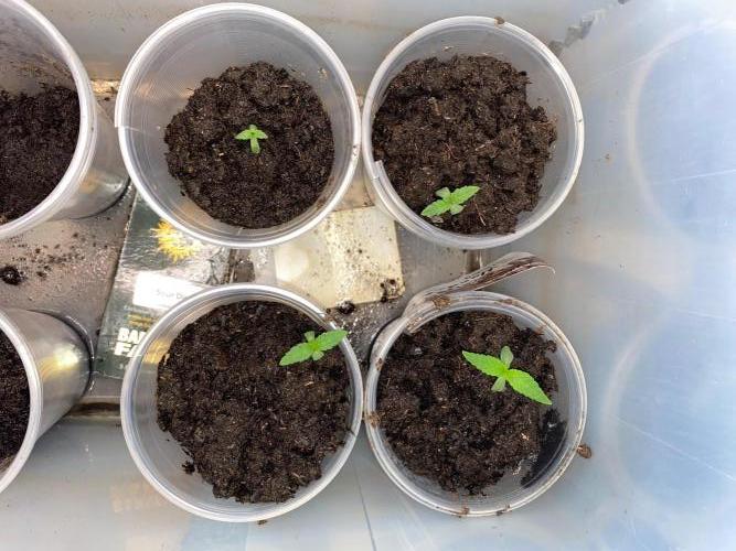 Четыре ростка дотянулись до верхнего края стаканов. Два Wedding Cake изначально были сильнее и крупнее, но один Sour Diesel их догнал. Второй растет медленнее, но развивается.