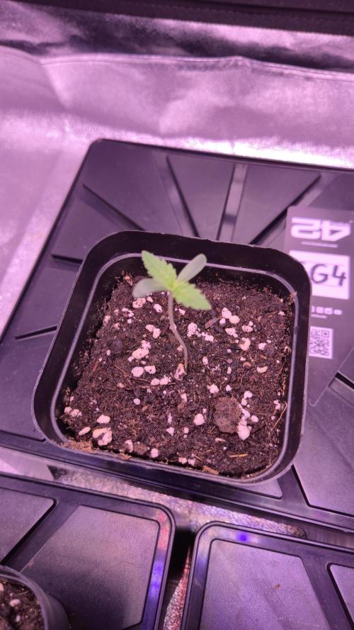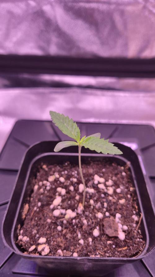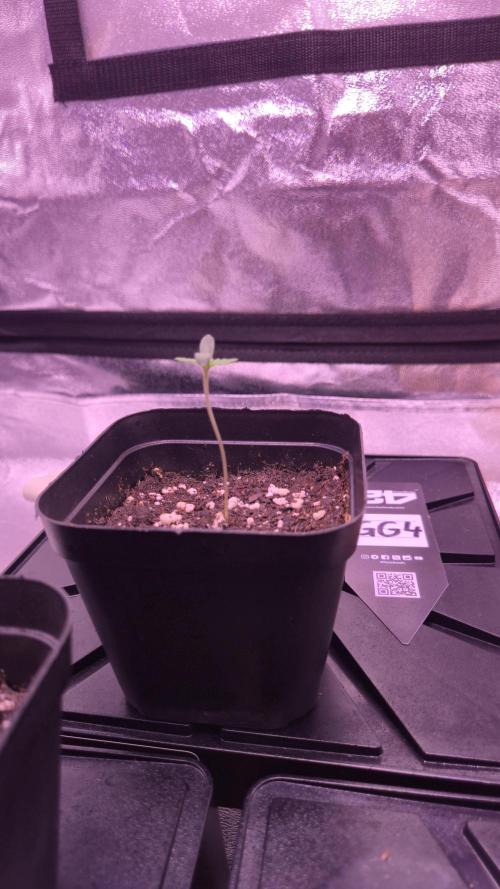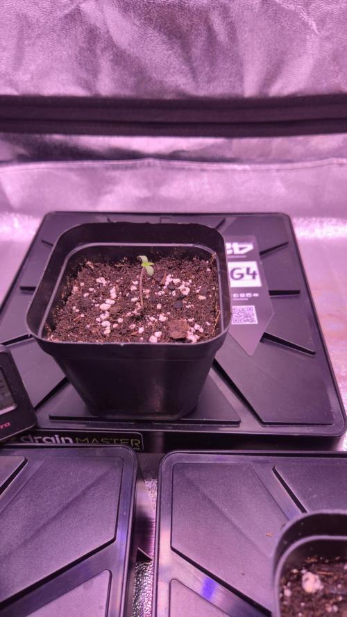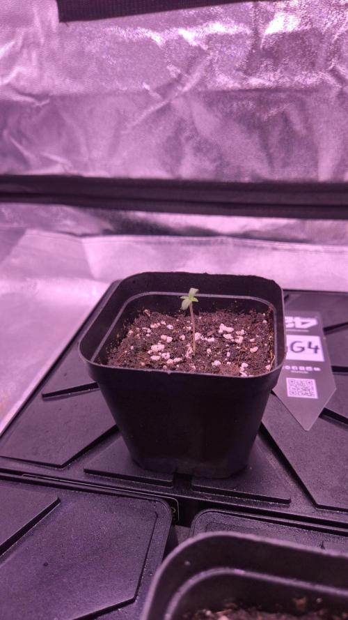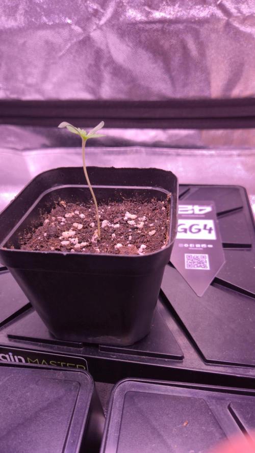 Nach den 31std. Keimzeit und erfolgreichen keimen, habe ich den Keimling in ca 0,6 liter Töpfe mit BioBizz Lightmix 70% und 30% Cocos von Plagron eigenmix vorgegossen und in ein 2-3cm tiefes Loch (natürlich in der mitte des Topfes) eingepflanzt.