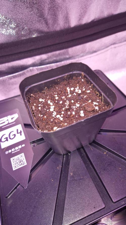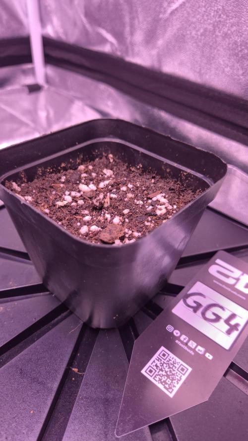 Den Topf habe ich im Zelt bei 24°C & 80% Luftfeuchtigkeit im Dunkeln stehen lassen (siehe Foto), leichte Luftzirkulation durch ein Ventilator (aber nicht auf die Töpfe) an. Bis der Keimling leicht aus den Boden kam. Dass, am Tag 3 geschah.