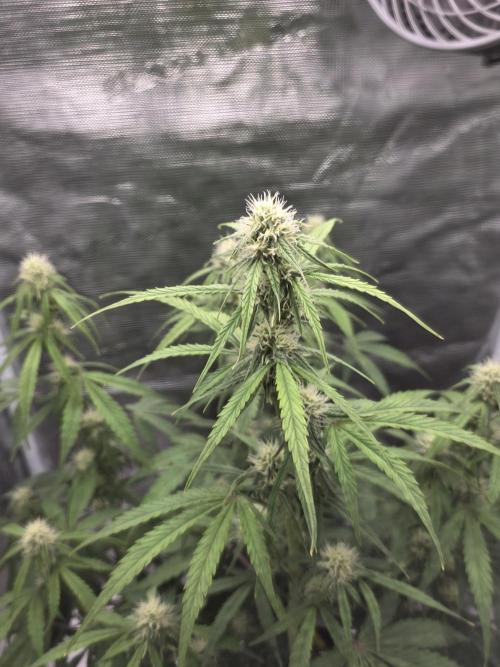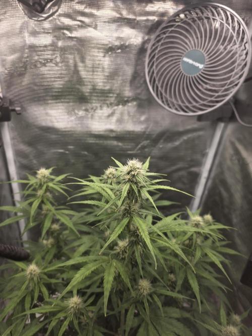 Kushcoma 10/10/25: Went away for a few days. She’s grown a lot. She’s showing pistils now, so she’s in her pre flowering stage. Increased PPFD from 320 to 360. RH from 65 to 60%