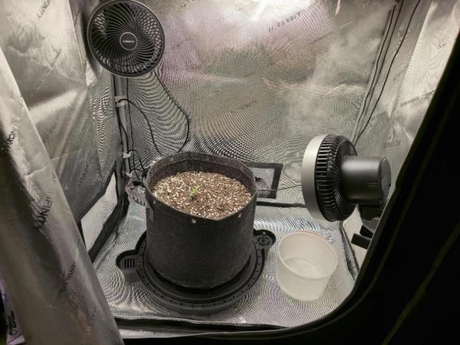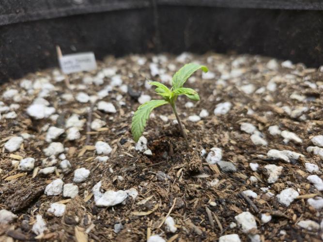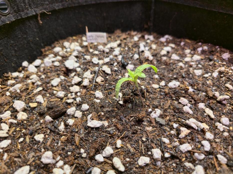 CalicoCatMom Planted directly into coco coir on 10/3/25 in windowsill container. Sprouted on 10/6/25 - moving to basement greenhouse. Starting build a soil in 7.5 gal fabric pot to get the living soil ready. There is currently two strains in the grow tent drying. Will move the seedling into the grow tent once the other strains are dray and ready to move out.
