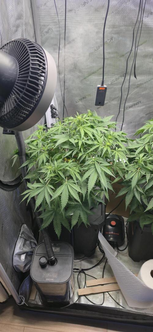 The temp seems to be perfectly ok, but the humidy is starting to climb with the plants getting bigger. So it's dehumidifier time. I'm planning on buying the AC Infinity one that connects to the system. But I have as small one for now. Environmentally speaking, everything is going great! Not too much wind, decent air exchange and bouncy CO2. Not sure how to fix that. I was considering routing the end of the exhaust duct back into the tent. I think I will. When I get these vent port caps. They are light proof but also provide air exchange. So I was thinking of taking the duct. Sticking it in the top vent port and letting that air flow through. If it works, I should have plenty of CO2 in the tent, the temp should stay pretty constant as well as the humidity. Well, kinda. The dehumidifier would have to work double time, but the other accessories, like the heater and the humidifier won't need to run as much. And considering this AI is keeping my tent spot on, I'm guessing spot on to spot on would make a perfect mix. We shall see. I have to wait a week or so for the port covers, which sucks. Because this is the very beginning of flower and I would love for the CO2 levels to be in the 1200s. I think.