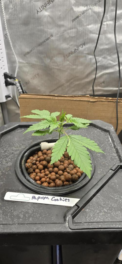 Papaya Cookies looks awesome! Her leaves are starting to expand more, her first node just came in and she's ready for more light. Maybe more nutrients. I should check that. But I'll empty the water next week. There isn't enough in there to cause any build up. So I can wait another week. Honestly I'm just trying to get into a schedule.