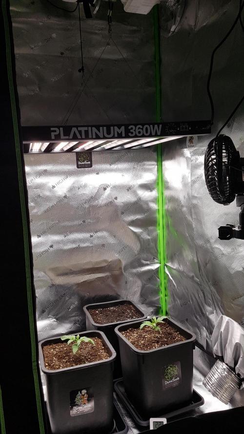 Das Setup läuft stabil: Die Lampe hängt in einem Abstand von ca. 25–30 cm über den Sämlingen und ist auf 25–30 % Leistung (etwa 150–200 µmol/m²/s PPFD) eingestellt. So wird übermäßiges Spargeln verhindert und die Sämlinge bekommen genau die richtige Lichtmenge.