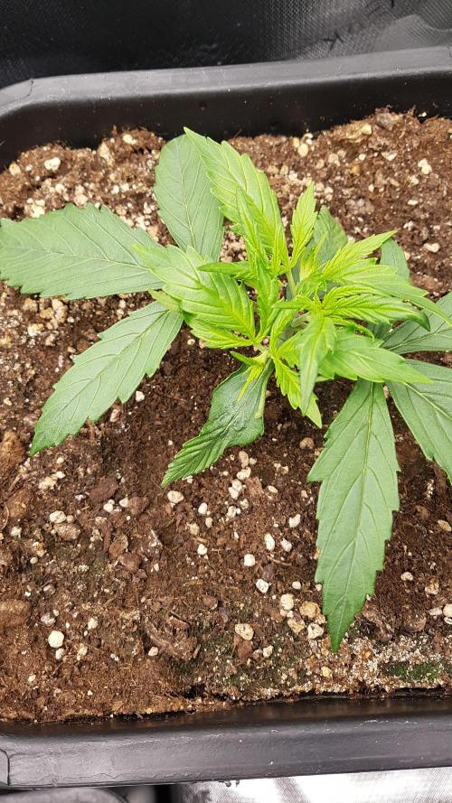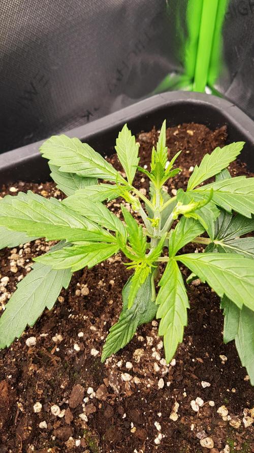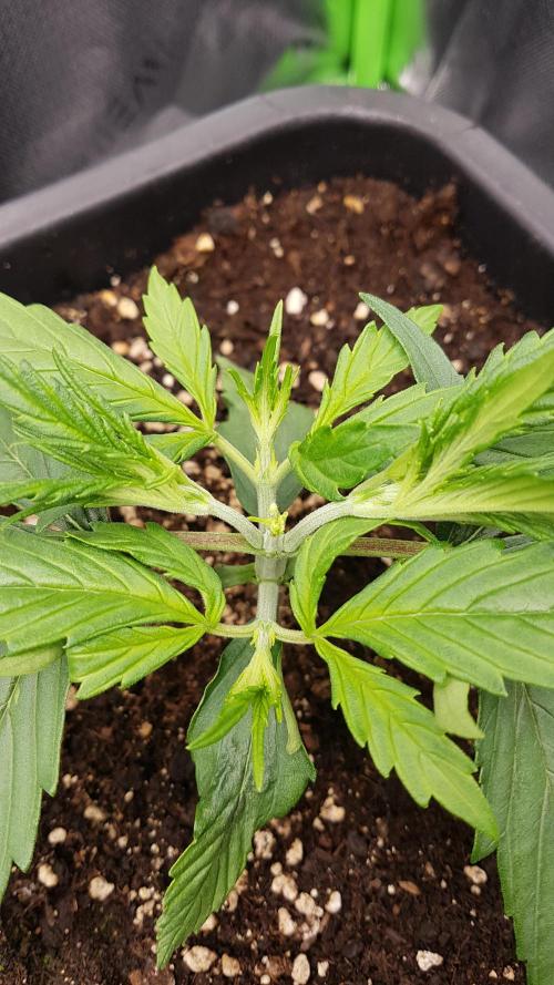 MonstaMurph Nach dem Toppen zeigt die Pflanze nun erste Anzeichen der Vorblüte. Zwischen den Nodien sind kleine weiße Härchen sichtbar, und das Wachstum hat sich leicht in die Höhe verlagert.
