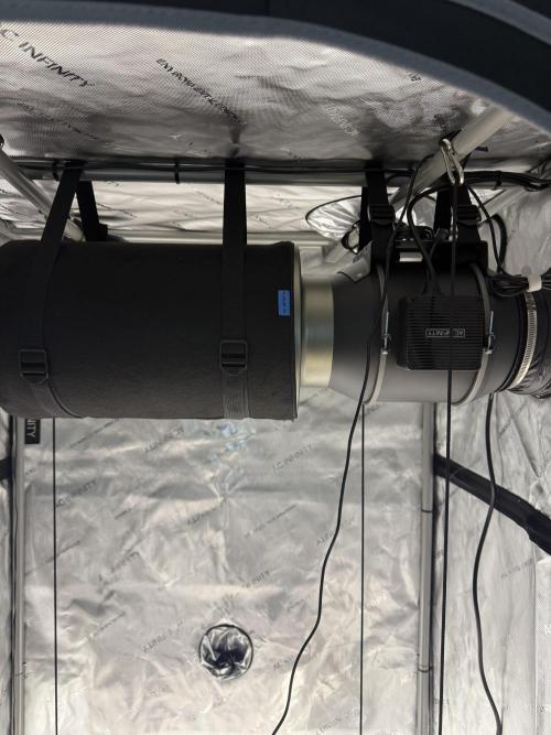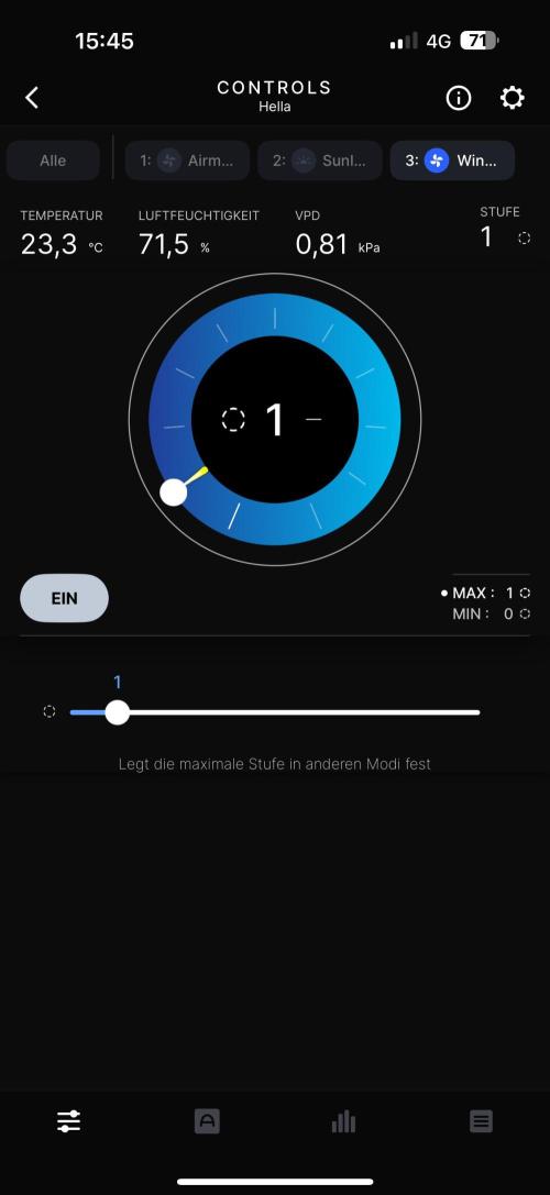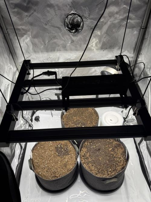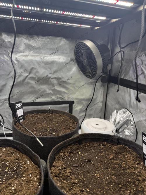 Xonidan Dienstag 23.9.25 habe ich sie in die Erde. Samstag 27.9.25 war sie komplett da. Licht ( eingemessen ) ca. 250 PPFD kommen an. Licht Abstand ca. 45 cm und Stufe 1 Ventilator Stufe 1