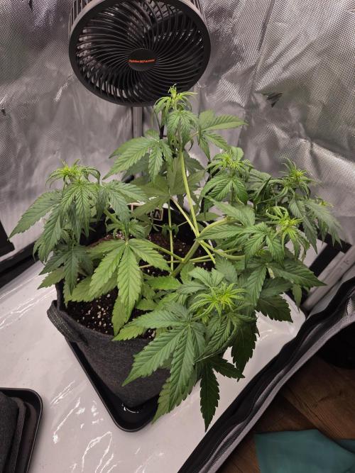 She’s really starting to take off — looks like she’s about to flip into flower soon (at least from my noob POV). I can already see some pistils popping. I did stress her a bit though — didn’t water in time and she got a little droopy the next day. Gave her a good drink right after and she bounced back nicely. We’ll see how she goes.