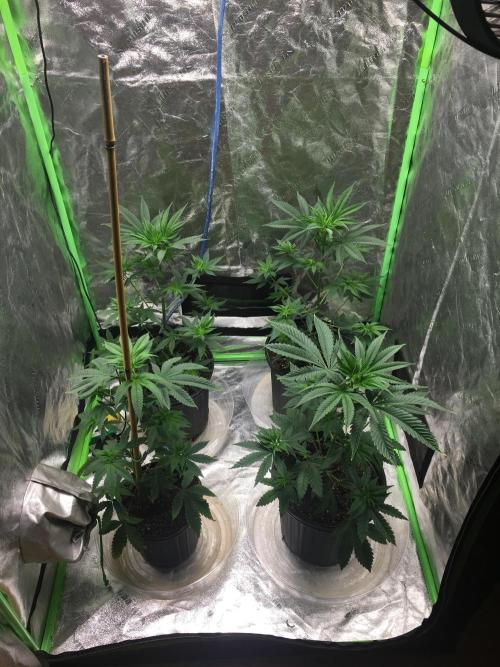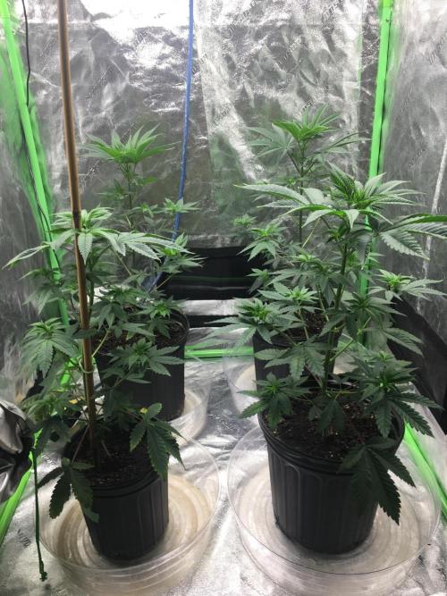 These ladies were started with my other grow (Ricky's Hash Plant + White Wedding RBX) but they finally got booted out. I was planning on letting them veg for one more week in the other tent but, fuck it, they're not going to get much larger since I am not transplanting them. Cramming four plants in under three square feet is tight, this is my "sea of green" attempt. I am currently growing some of these plants outdoors and they had a decent stretch to them when they flipped to flower. Hoping this little tent will be packed. That being said, I have my reservations about the strength of this light. I am testing how it works with this run. Ultimately, this tent (and light) were purchased with mother/veg in mind so this will probably be the only time this light does flower (except maybe a sex test run).