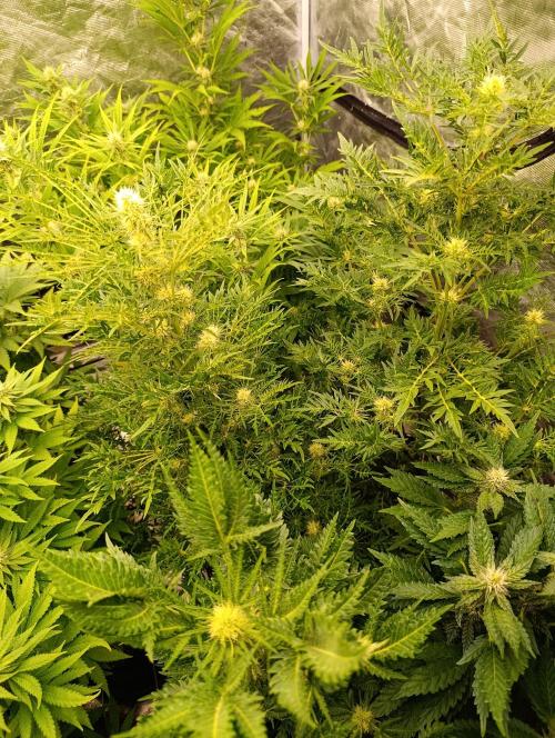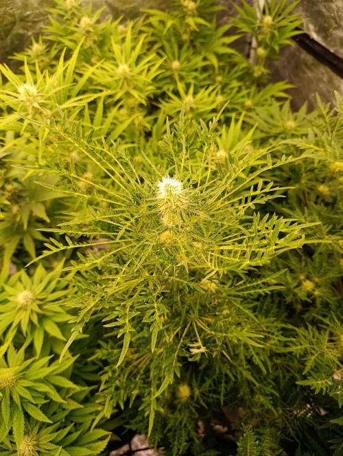 El follaje sigue verde y saludable, con solo leves ajustes de nutrición necesarios en algunas hojas más bajas, que responden bien a un riego equilibrado y suplementación ligera. La estructura abierta sigue favoreciendo la circulación de aire y la penetración de luz, permitiendo que cada cogollo se desarrolle parejo y con vigor.