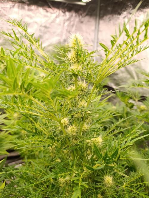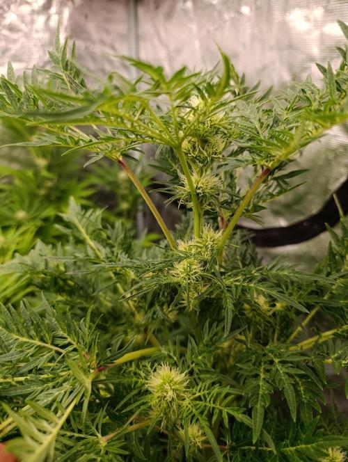 La Mentha de Croco inicia su segunda semana de floración con un crecimiento constante y equilibrado. Sus ramas principales y laterales se estiran con armonía, mientras los pistilos comienzan a aparecer marcando los primeros indicios de floración. La genética muestra buena estabilidad y aprovecha la luz de manera eficiente, aunque con un desarrollo algo más contenido que otras variedades más vigorosas.