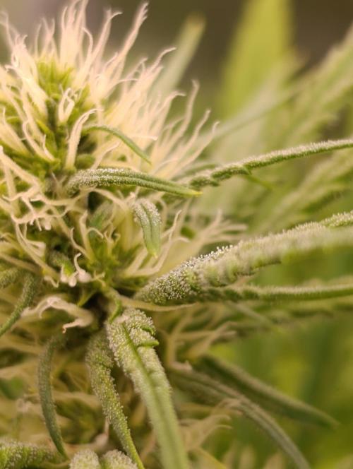 La A5 Chaze de Terpyz avanza firme en su tercera semana de floración. Los pistilos se multiplican y empiezan a formar pequeñas coronas, mientras el estiramiento se mantiene controlado y equilibrado. Tras el ajuste nutricional, el verde vuelve a lucir más uniforme y la planta muestra buena vitalidad.