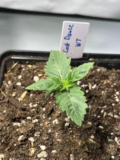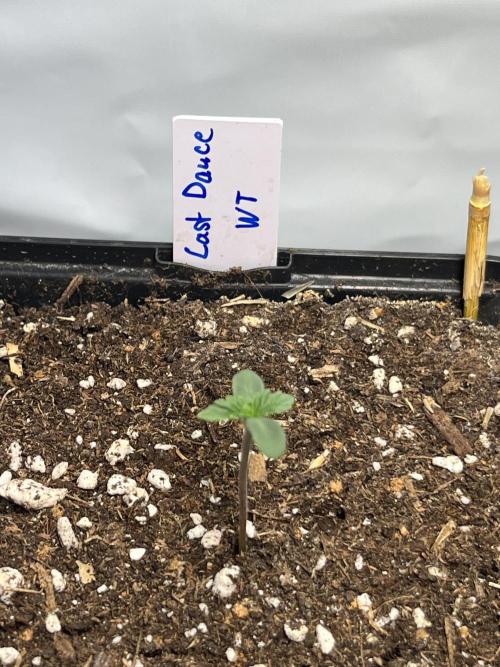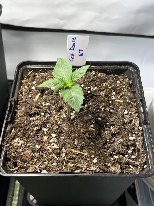 Last Dance was the first who broke through the surface. She looks definitely like a more indica leaning hybrid with this typical leaf structure. Also she doesn’t like the light intensity like the other two plants in the seedling tent. Curled her leaves which can be a sign of too excessive light intensity. Pulled the pot a little bit more away from the light. Let’s see if something will change within the next few days.