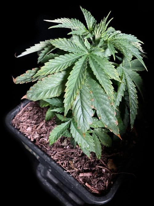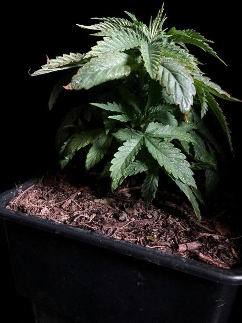 Hace 3 días, después de pasar la mañana al sol, hice el trasplante de la plántula a la maceta final, una maceta de la vieja escuela de 7 litros, con aireación lateral y color negro. Esta maceta estaba llena desde hace 15 días con la mezcla de sustrato que hice para esta temporada, sustrato que humedecí con agua de manantial, melaza y Microorganismos autóctonos de Montaña Activados (MMA) de forma líquida, para que la microbiología se instalara en el sustrato y comenzara a disolver los nutrientes y minerales presentes en el sustrato.
