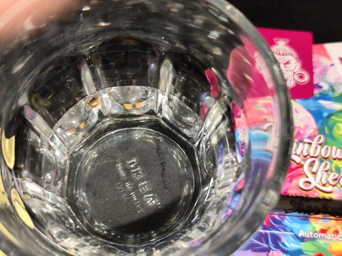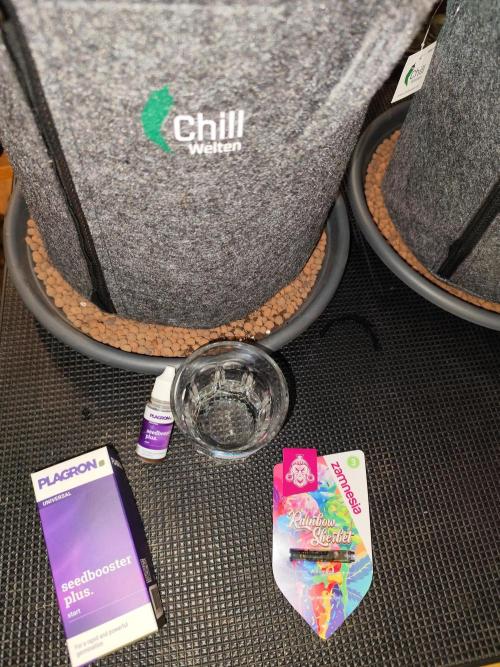 Tag -1: Einen Liter Wasser mit 7 Tropfen Plagron Seedbooster Plus vorbereitet. Den Samen in einem Glas Wasser mit PSP über Nacht eingeweicht. Der Rest ist das erste Giesswasser für die Rainbow.