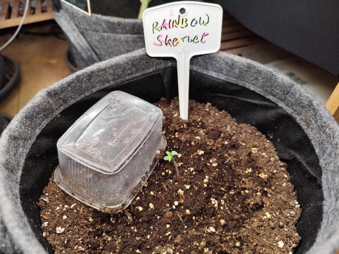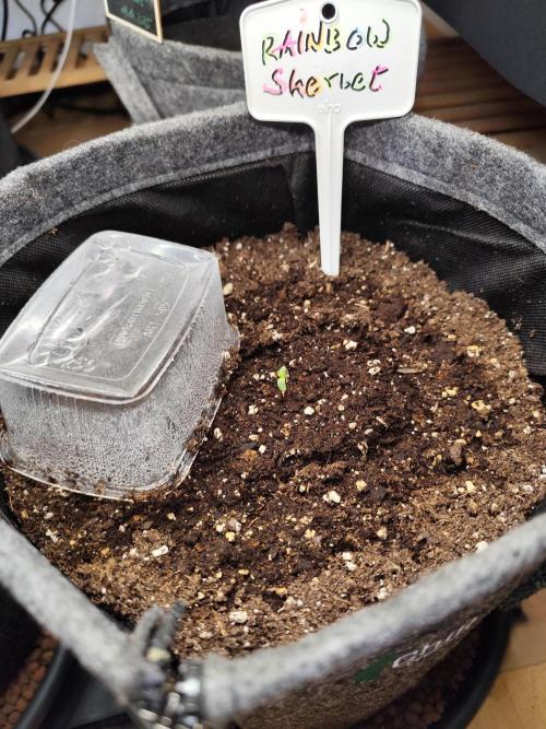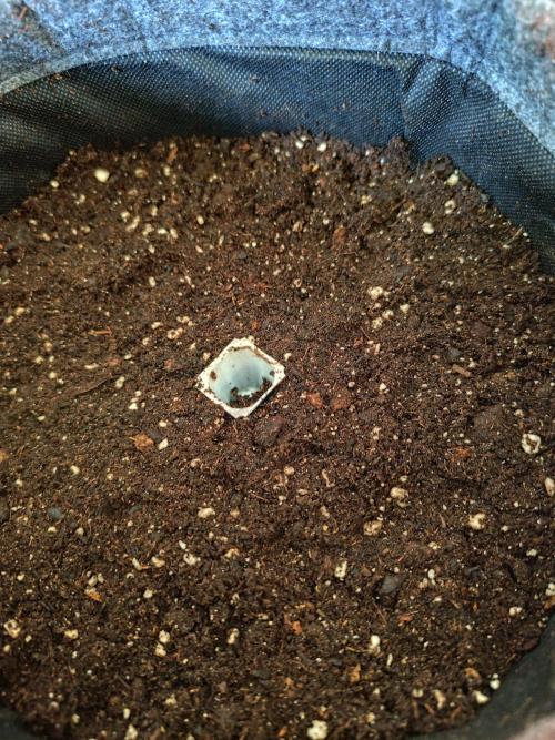 Tag 0: Einen Zamnesia Smart Start Plug vorbereitet, das Loch vergrößert und einmal komplett durchgestochen. Den Rainbow Sherbet Automatic Samen mit der Spitze nach unten in den Zamnesia Smart Start Plug eingelegt, mit der Hülle des Plugs das Pflanzloch ausgestochen und den Plug in das entstandene Pflanzloch gedrückt, fertig. Zum erhöhen der Luftfeuchtigkeit mit einem Plastikbecher abgedeckt.