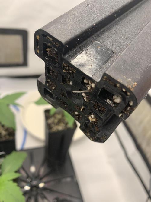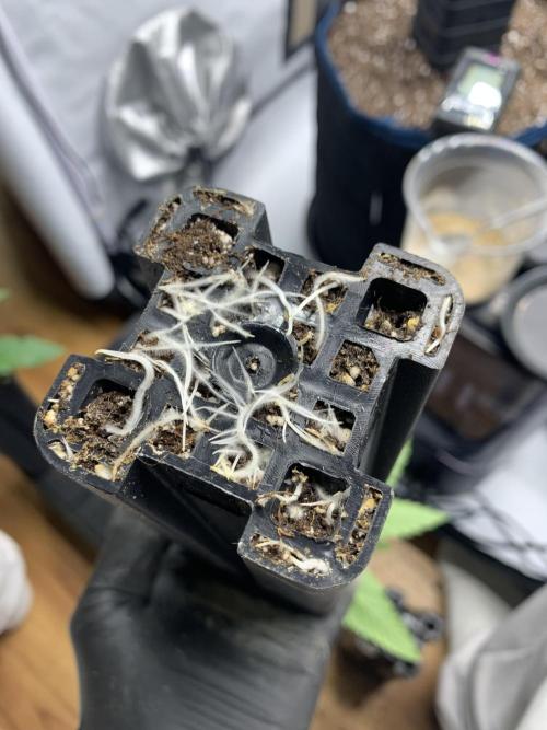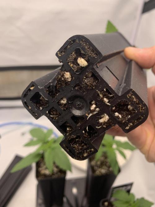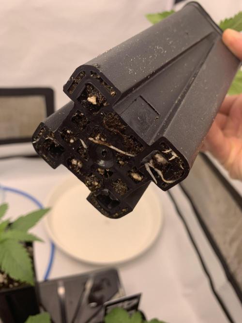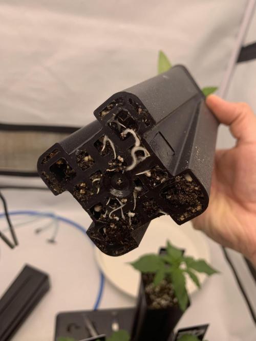 They are all showing the first roots at the bottom of the growing pot and can hopefully be repotted into the 20 l pots of the autopot system for the next watering.