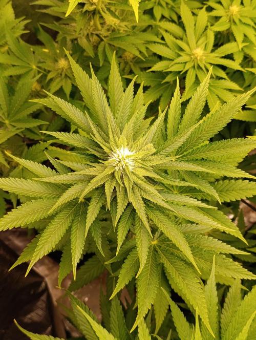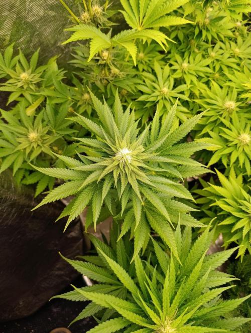 El follaje luce verde y saludable, aprovechando la luz y la ventilación al máximo gracias al entrenamiento previo. La genética responde con estabilidad y energía.