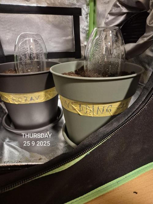 29.09. Mehrere Sprühstöße Wasser und die Gläser entfernt. Weil die Pflanzen so vergeilt sind habe ich die Lampe auf 30% und den Abstand auf etwa 30 cm verringert. Ich vermute die Gläser sind Schuld am spargeln der Ladies. Habe im Zelt ein nasses Handtuch und eine Schale mit zwei nassen Tüchern um die Luftfeuchtigkeit am Anfang noch hoch zu halten.